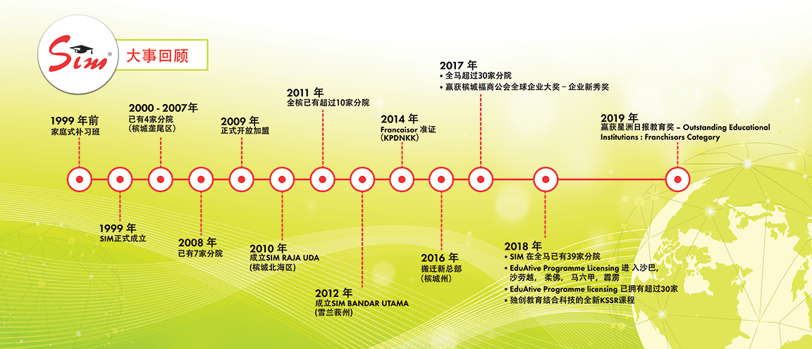 SIM连锁教育集团于1999年由李碧华院长所创办。秉持着“一心为孩子,三心爱开放”的教育方针,SIM连锁教育集团培训每位老师以至诚的爱心对待每位学生,希望学生们在这里能够开心地学习,同时让家长们放心。 悉心培育孩子们的SIM连锁教育集团,在教育路上孜孜不怠,尽心尽力给予孩子们最完善的照顾与教导。